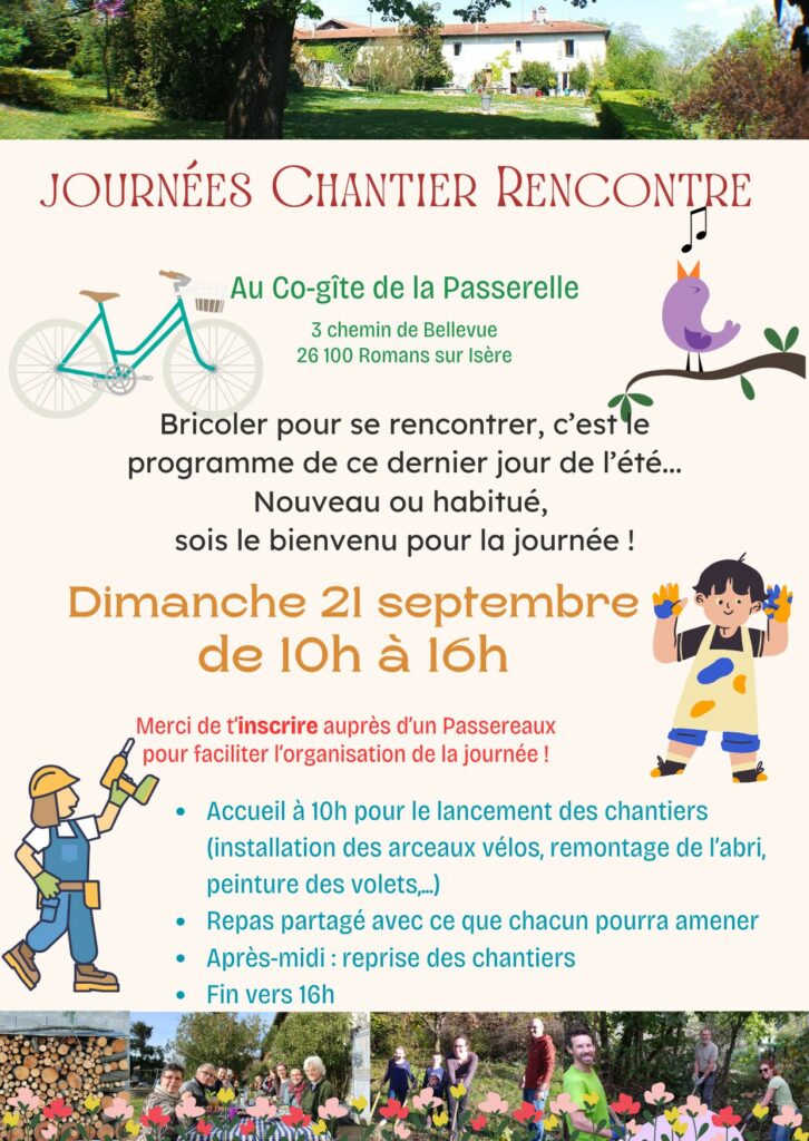 Attention, pour le mois de septembre, le chantier-rencontre aura lieu le 21 septembre (et non le 2e dimanche du mois comme habituellement) !