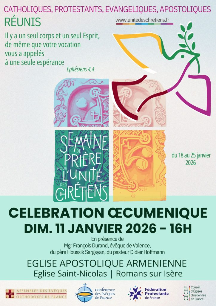 Notre collectif a la particularité d’être intéressé par l’œcuménisme (le dialogue entre les différentes communautés et églises chrétiennes)… et à Romans, une célébration oecuménique est organisée, à l’occasion de la semaine pour l’unité des chrétiens, le 11 janvier à 16h à l’église St Nicolas.