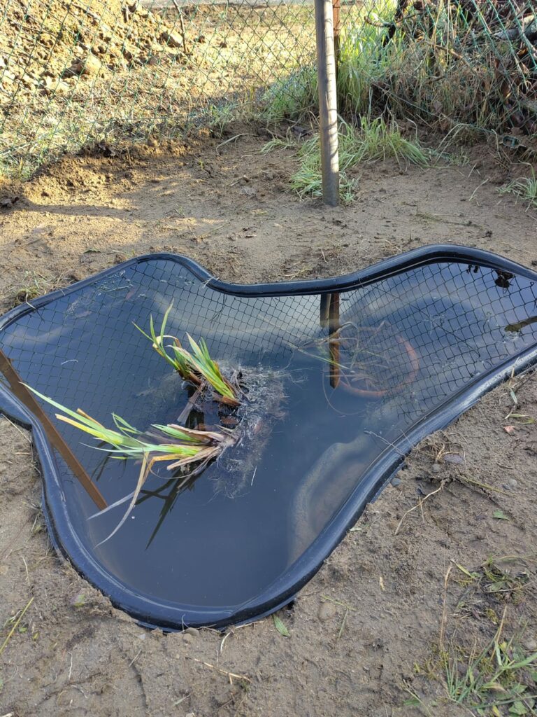 En janvier, on a creusé pour se réchauffer, et installé la mare, dans le (futur) poulailler…